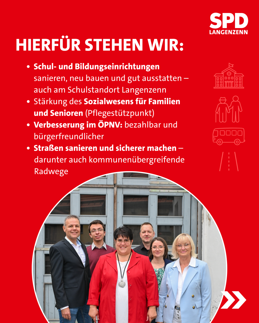 Neben unserer Bürgermeisterkandidatin Melanie Plevka, die gemeinsam mit Michael Bischoff das Spitzenduo für den Landkreis bildet, stellen sich folgende Kandidatinnen und Kandidaten zur Wahl: 🗳️ 2. Melanie Plevka 16. Irene Franz 23. Sebastian Zeiler 28. Katharina Sieber 37. Johnny Winkler 58. Sebastian Steinkirchner Die SPD Fürth Land setzt in ihrem Wahlkampf vor allem auf das Thema „Nachbarschaft“. 🤝 Das Miteinander soll im Vordergrund stehen und eine transparente Politik gestaltet werden. Gemeinsam sollen die Bildungs- und Schuleinrichtungen des Landkreises ausgebaut, saniert und gut ausgestattet werden. 🎓 Ferner setzt man sich für eine Stärkung des Sozialwesens ein, zum Beispiel durch die Einrichtung eines Pflegestützpunkts im Landkreis. Außerdem muss der ÖPNV bezahlbarer und bürgerfreundlicher werden. 🚍 Zudem müssen Landkreisstraßen saniert und sicherer gemacht sowie weitere kommunenübergreifende Radwege geschaffen werden. 🚲 Dafür werden sich die Kandidatinnen und Kandidaten der SPD Langenzenn einsetzen! ✊🏻